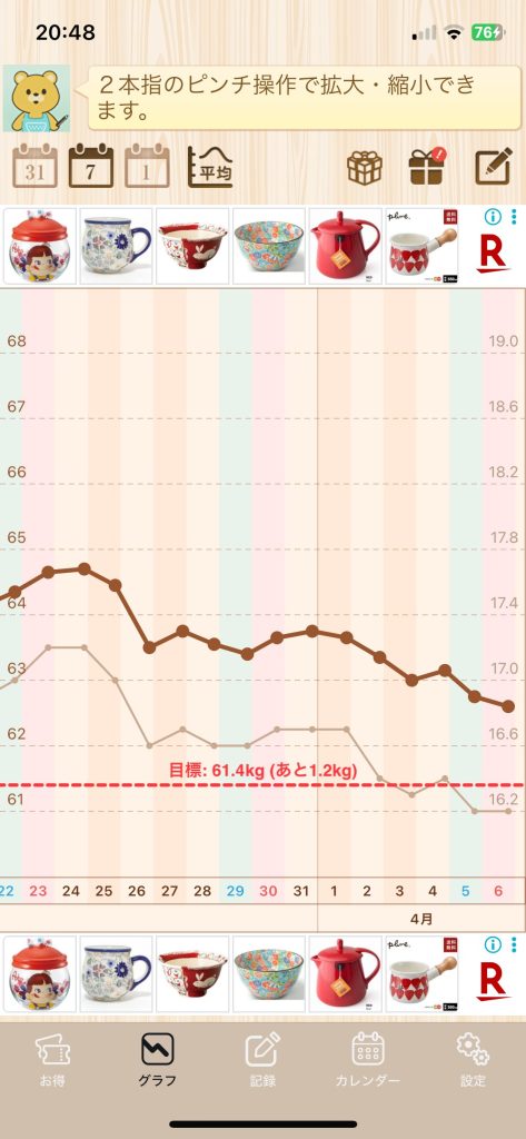 体重60kgなら、月に1.2〜2.4kgの減少が理想的。